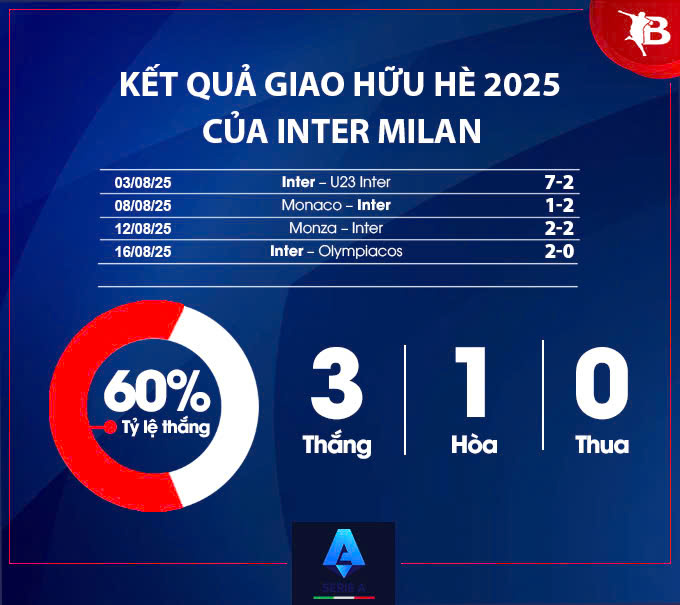 Trong mùa hè 2025, Inter chỉ thi đấu 4 trận giao hữu với kết quả thắng 3 và hòa 1. Họ thắng đội U23 của mình với tỷ số 7-2, thắng Monaco 2-1 và thắng Olympiacos 2-0. Trận hòa duy nhất là 2-2 với Monza.