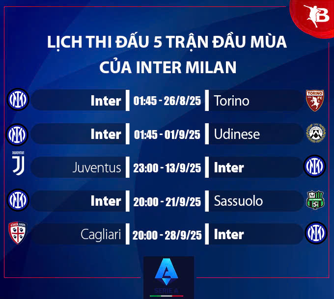 Chivu sẽ có màn ra mắt tại San Siro bằng trận gặp Torino, đội bóng quen thuộc ở nhóm giữa bảng, ngay vòng mở màn. Sau đó, Inter tiếp Udinese tại Meazza trước khi chạm trán kình địch Juventus ở Derby d’Italia trên sân Allianz. Lượt về sẽ diễn ra vào giữa tháng 2 tại Milan.