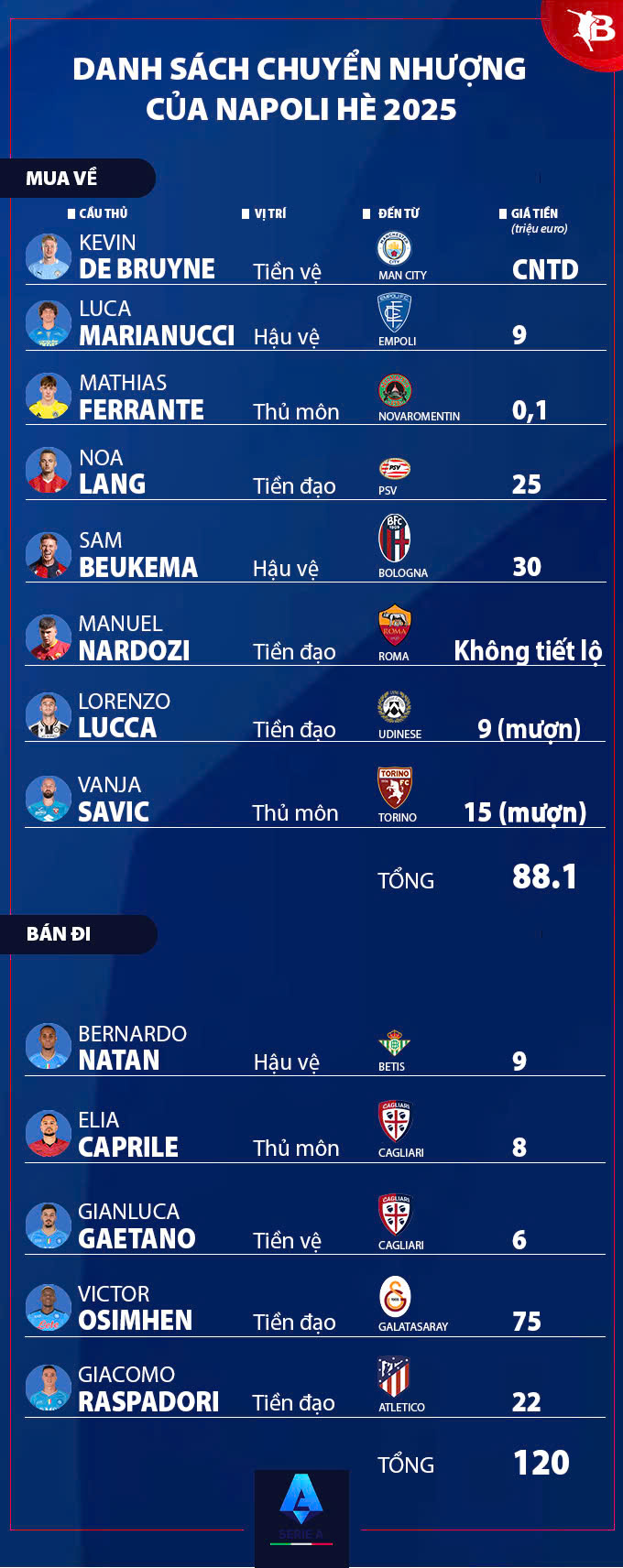 Mùa hè ở Naples vô cùng bận rộn. Với tham vọng củng cố vị thế ứng cử viên số một, Napoli đã chốt hàng loạt thương vụ đình đám, trong đó có việc chiêu mộ huyền thoại Kevin De Bruyne từ Man City theo dạng tự do.
