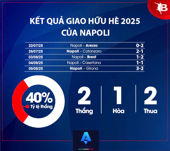Napoli thi đấu giao hữu khá nhiều trong loạt trận tiền mùa giải 2025/26. Trong số 7 lần ra sân, họ thắng tới 4, hòa 1 và thua 2. Đáng chú ý là các đối thủ của Napoli đều không phải các đội hàng đầu. Điều này khiến sức mạnh của họ chưa được kiểm chứng một cách sát sao nhất.