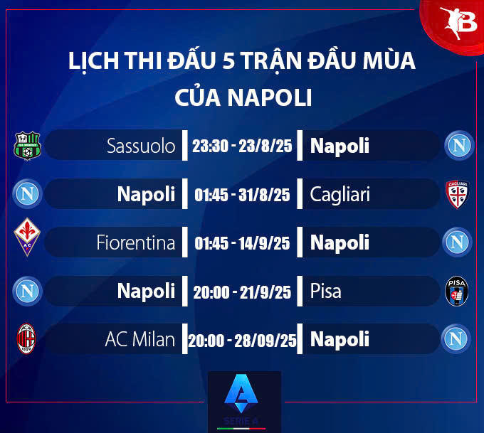 Hành trình bảo vệ ngôi vương của Napoli sẽ khởi đầu vào ngày 23/8 với chuyến làm khách trước tân binh Sassuolo tại sân Mapei. Đối thủ của họ trong trận sân nhà đầu tiên tại vòng hai là Cagliari, đội thường xuyên vật lộn ở nửa dưới BXH.