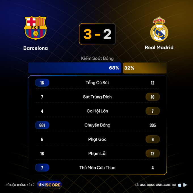 Theo dữ liệu từ Uniscore, Barcelona kết thúc trận đấu với 68% thời lượng kiểm soát bóng, phản ánh rõ triết lý chiếm lĩnh không gian và nhịp độ. Blaugrana chủ động triển khai từ tuyến dưới, duy trì cấu trúc đội hình và liên tục kéo giãn hệ thống phòng ngự của Real Madrid. 661 đường chuyền được thực hiện với độ chính xác vượt mốc 90%. Con số này cho thấy Barca không chỉ giữ bóng nhiều, mà còn giữ bóng có mục đích. Họ kiên nhẫn luân chuyển để tìm khoảng trống, hạn chế tối đa những pha mất bóng nguy hiểm trước một đối thủ phản công hàng đầu châu Âu.