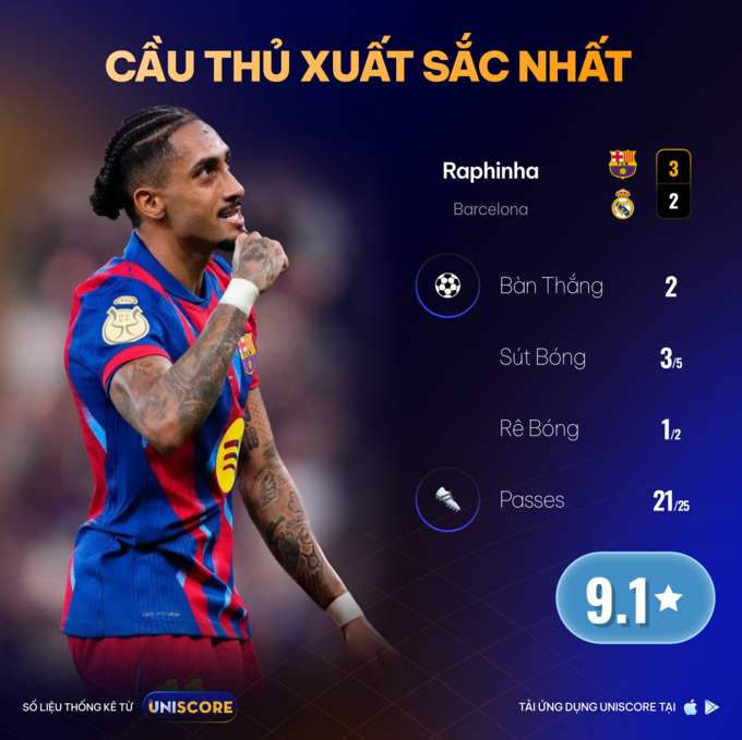 Raphinha là cái tên nổi bật nhất trận đấu. Cầu thủ người Brazil ghi 2 bàn, được chấm 9.1 điểm từ Uniscore, trực tiếp định đoạt kết cục và khép lại giải đấu với danh hiệu Vua phá lưới Siêu Cúp. Không chỉ là số lượng, mà còn là thời điểm ghi bàn. Bàn mở tỷ số giúp Barcelona chiếm lợi thế tâm lý, trong khi pha lập công thứ hai đến đúng lúc Real Madrid đang gia tăng sức ép. Đó là sự khác biệt của một cầu thủ lớn trong một trận đấu lớn.
