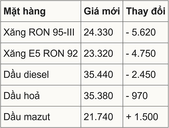 Xăng E5RON92: không cao hơn 23.326 đồng/lít (giảm 4.749 đồng/lít so với giá bán tối đa hiện hành), thấp hơn xăng RON95-III 1.006 đồng/lít.