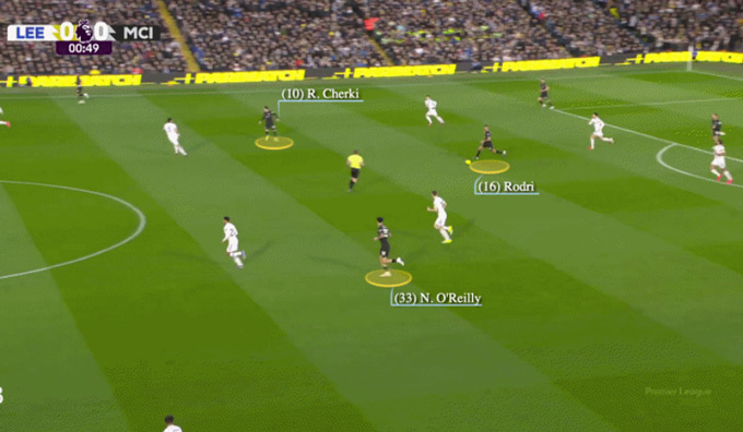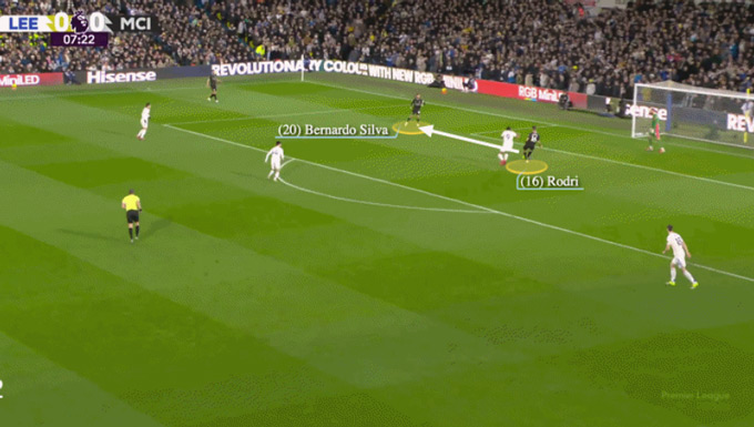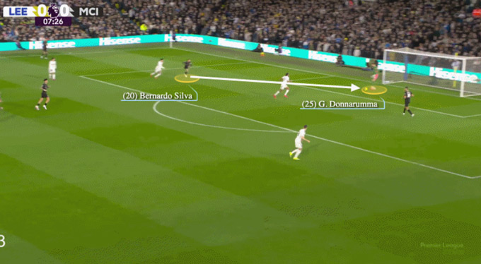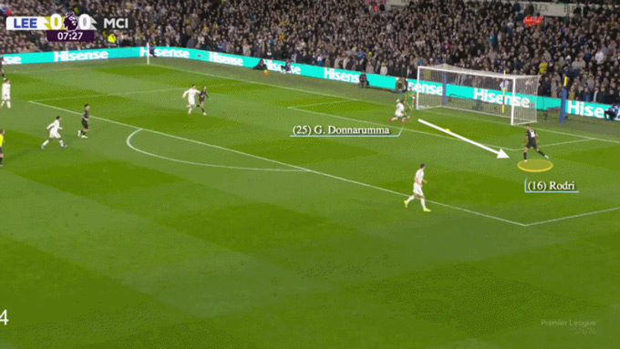 Trong trận thắng Leeds 1-0, HLV của Man City yêu cầu hai tiền vệ trụ Rodri và Bernardo Silva lùi sâu vào hai góc ở khu 5m50 mỗi khi phát bóng lên. Thay vì để trung vệ đảm nhiệm vai trò khởi phát, ông đưa những cầu thủ kiểm soát bóng tốt nhất xuống làm "điểm thoát pressing".