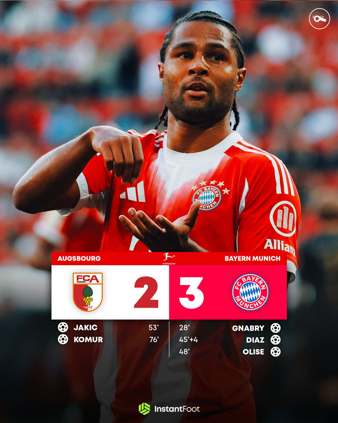 Trong khi đó tại vòng 2 Bundesliga, Bayern giành 3 điểm khá chật vật trước Augsburg. Gnabry mở tỷ số cho Hùm xám ở phút 28 trước khu Luis Diaz nhân đôi cách biệt ở phút 45+4. Ngay đầu hiệp 2, Olise đã ghi bàn thứ 3 cho đội khách Bayern.