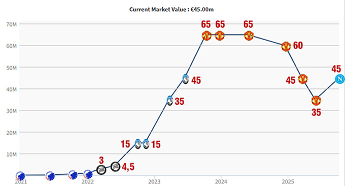Hè 2023, Rasmus Hojlund được Transfermarkt định giá 65 triệu euro ở thời điểm gia nhập MU. Nhưng do thể hiện màn trình diễn không tốt trong màu áo Quỷ đỏ, chân sút người Đan Mạch liên tục rớt giá khi lần lượt rơi xuống mức 60 triệu euro (12/2024), 45 triệu euro (3/2025) và 35 triệu euro (5/2025).