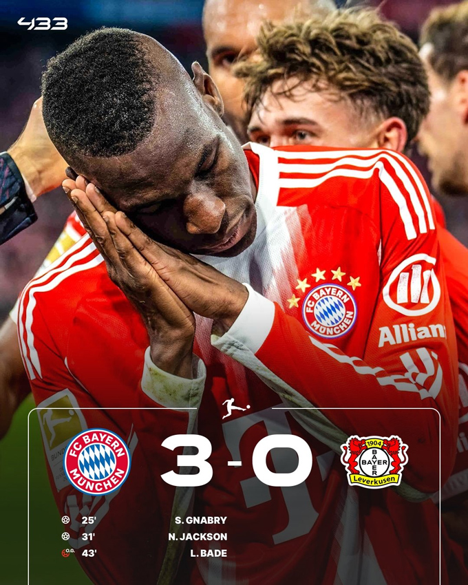 Chuyển sang vòng 9 Bundesliga, Bayern Munich có chiến thắng đậm 3-0 trước Leverkusen. Nicolas Jackson trong ngày đá chính thay Kane đã ghi bàn nâng tỷ số lên 2-0. Trước đó, Serge Gnabry là người mở tỷ số và bàn ấn định là pha phản lưới nhà của Bade bên phía Leverkusen. Kết quả này giúp đội chủ sân Allianz Arena xây chắc ngôi đầu Bundesliga khi có 27 điểm trong tay.