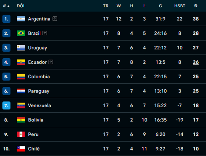 Còn Brazil, họ cũng xây chắc ngôi nhì bảng khi đánh bại Chile 3-0 nhờ các bàn thắng của Estevao (38'), Paqueta (72'), Bruno Guimaraes (76').