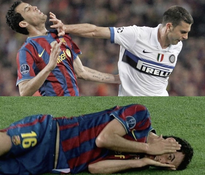 Nếu Ronaldo đôi lúc chỉ “thêm mắm muối”, thì Sergio Busquets lại được xem là “giáo sư” trong nghệ thuật đánh lừa trọng T. Tiền vệ phòng ngự của Barcelona nổi tiếng với pha nằm sân đầy kịch tính ở bán kết Champions League 2010 gặp Inter Milan, khi anh bị Thiago Motta huých tay.