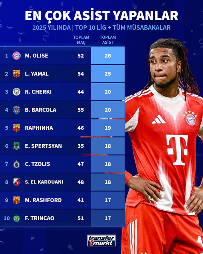 Theo thống kê của Transfermarkt, Olise có 26 đường chuyền thành bàn cho Bayern Munich trên mọi đấu trường trong năm 2025. Tuyển thủ Pháp kết thúc năm nay với vị trí đứng đầu danh sách các cầu thủ kiến tạo nhiều nhất ở 10 giải VĐQG hàng đầu châu Âu.