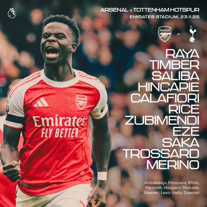 - Arsenal (4-3-3): Raya; Timber, Saliba, Mosquera, Hincapie; Eze, Zubimendi, Rice; Saka, Merino, Trossard.
