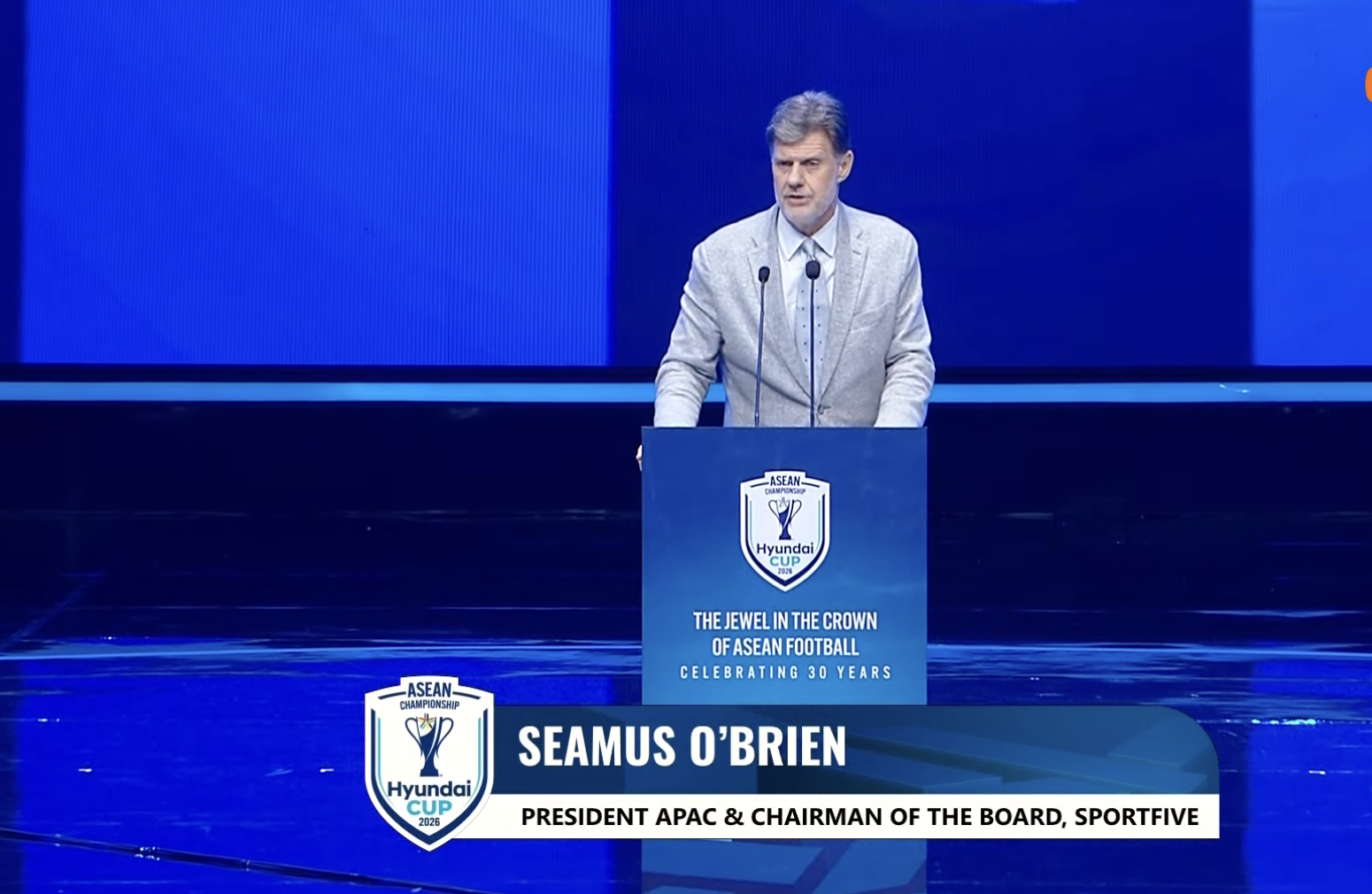 Đại diện của đối tác truyền thông Sportfive - ông Seamus O' Brien phát biểu tại buổi bốc thăm AFF Cup 2026