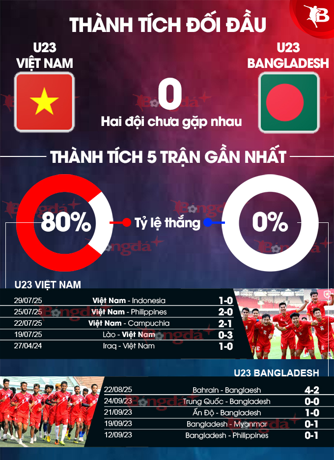- Trên bảng xếp hạng FIFA, ĐT Bangladesh đứng thứ 184 thế giới. Trong khi đó, ĐT Việt Nam xếp hạng 113 thế giới. So về 2 ĐTQG, sự chênh lệch đến 71 bậc cho thấy khác biệt về trình độ chuyên môn giữa 2 nền bóng đá và cũng có thể làm một phép liên tưởng về tương quan lực lượng giữa 2 đội tuyển ở cấp độ thấp hơn là U23 Việt Nam và U23 Bangladesh. Dẫn dắt U23 Bangladesh là HLV AKM Saiful Bari Titu khá dày dặn kinh nghiệm khi làm công tác huấn luyện trong hơn 20 năm qua.