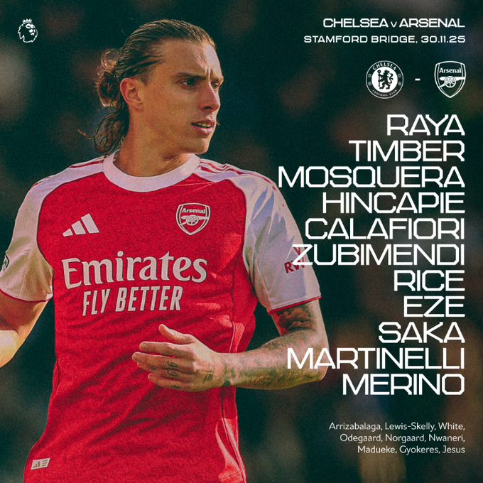 Arsenal: Raya, Timber, Mosquera, Hincapie, Calafiori, Zubimendi, Rice, Eze, Saka, Martinelli, Merino