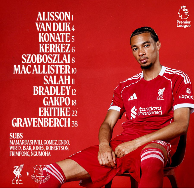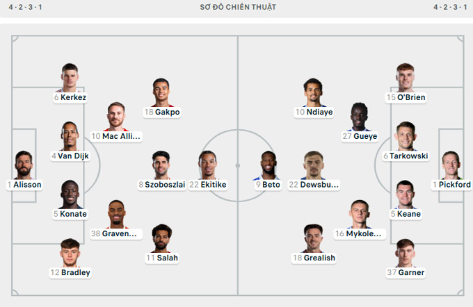 Sau khi Liverpool phải căng sức ở Champions League, HLV Slot quyết định xoay tua đội hình trước Everton, với Hai bản hợp đồng bom tấn là Isak cùng Wirtz đều ngồi dự bị. Trên hàng công, Ekitike đá cắm, hỗ trợ cho anh là bộ ba Gakpo, Szoboszlai, Salah trong hệ thống 4-2-3-1 quen thuộc. Cặp tiền vệ trung tâm của Liverpool là Mac Allister - Gravenberch, còn bộ tứ vệ gồm Kerkez, Van Dijk, Konate và Bradley.