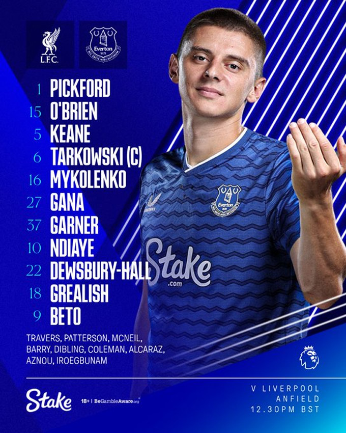 Everton: Pickford, Mykolenko, Tarkowski, Keane, O'Brien, Gueye, Garner, Grealish, Dewsbury-Hall, Ndiaye, Beto.