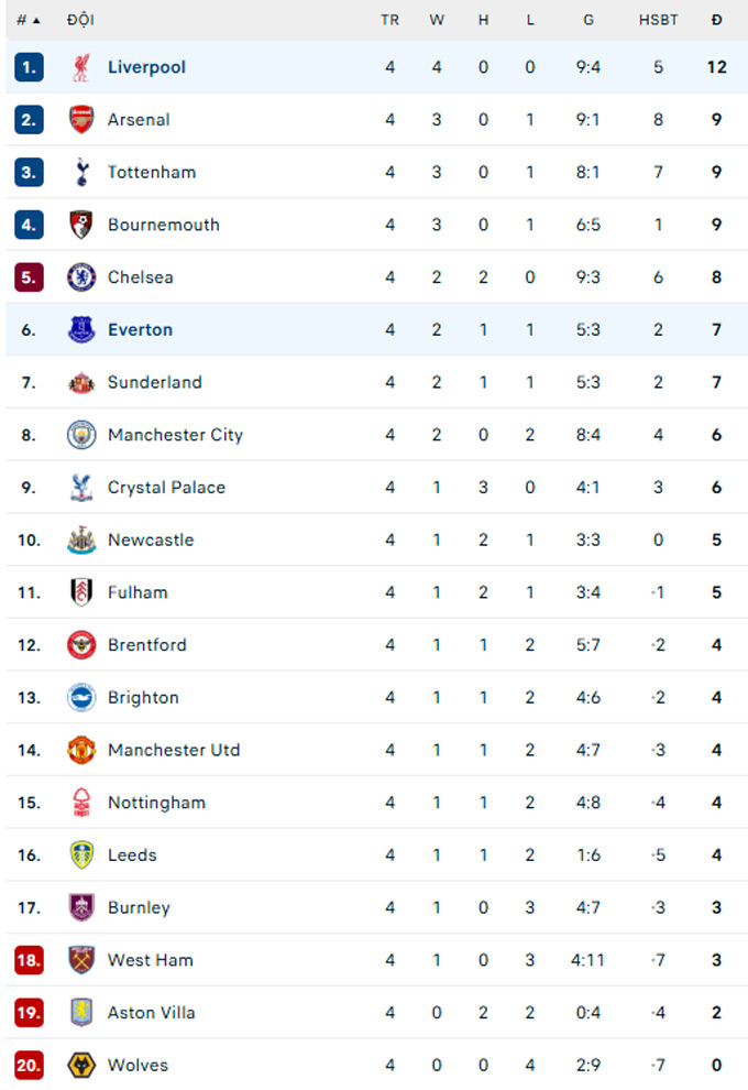 Hiện tại, Liverpool đang đứng đầu Premier League với 12 điểm tuyệt đối sau 4 vòng, còn Everton xếp thứ 6 với 7 điểm. Mục tiêu của The Reds trận này chắc chắn là giành 3 điểm nhằm duy trì mạch toàn thắng.