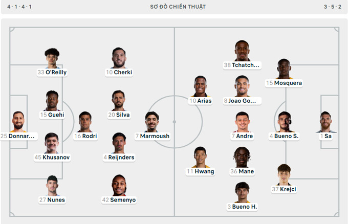 Ở trận cầu hôm nay, Man City ra sân với sơ đồ 4-1-4-1 quen thuộc. Tuy nhiên, có một điểm đáng chú ý là HLV Guardiola cho tiền đạo ngôi sao Haaland ngồi dự bị. Lĩnh xướng hàng công của Man xanh là Marmoush. Bộ tứ chơi giăng ngang phía dưới hỗ trợ gồm Cherki, Silva, Reijnders và Semenyo. Ở hàng thủ, trung vệ tân binh Guehi ra mắt, đá cặp bên cạnh Khusanov.