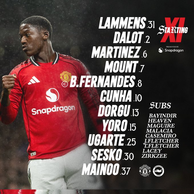 - MU (4-2-3-1): Lammens; Dalot, Heaven, Martinez, Shaw; Casemiro, Ugarte; Dorgu, Fernandes, Cunha; Sesko