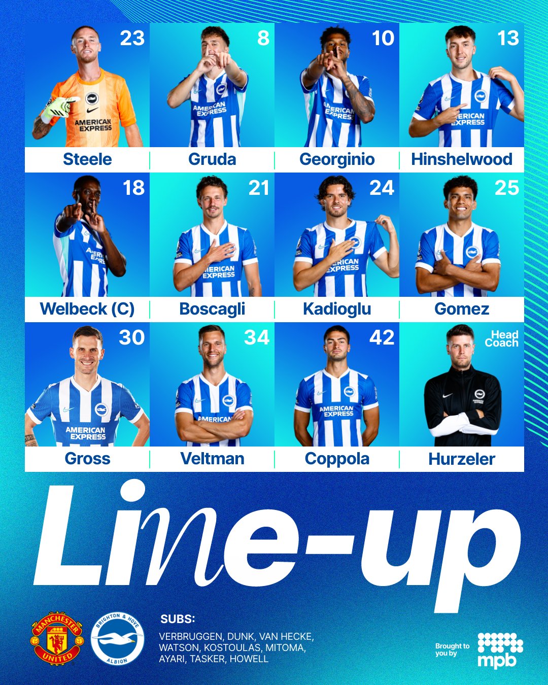 - Brighton (4-2-3-1): Verbruggen; Veltman, Van Hecke, Dunk, Kadioglu; Ayari, Gomez; Gruda, Rutter, Mitoma; Kostoulas.