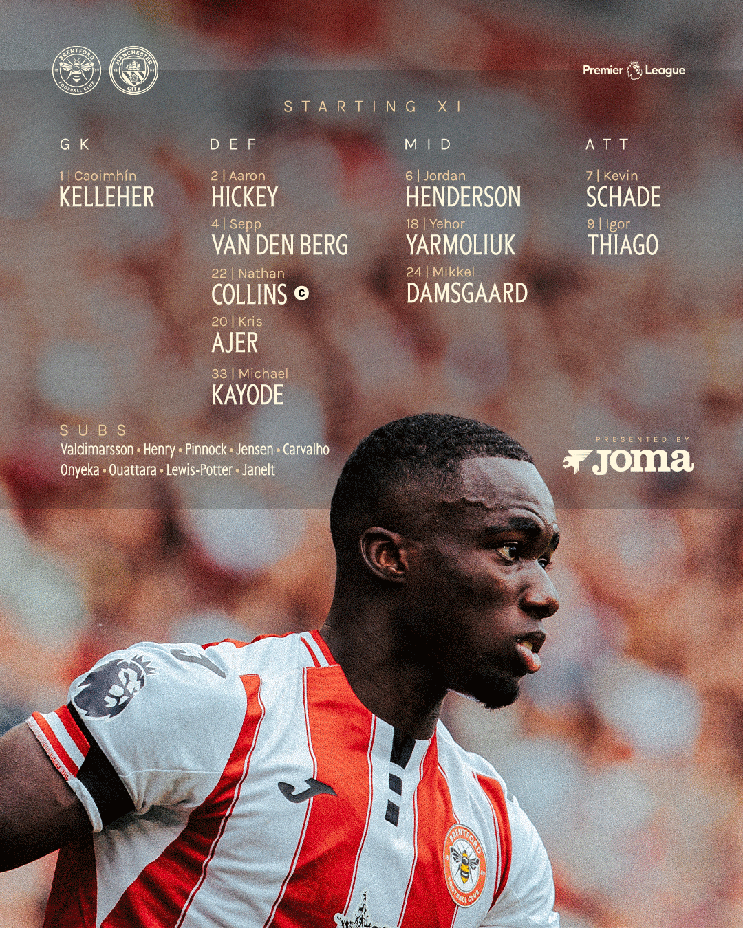 - Brentford (4-2-3-1): Kelleher; Kayode, Collins, Van den Berg, Hickey; Henderson, Yarmoliuk; Ouattara, Damsgaard, Schade; Thiago.