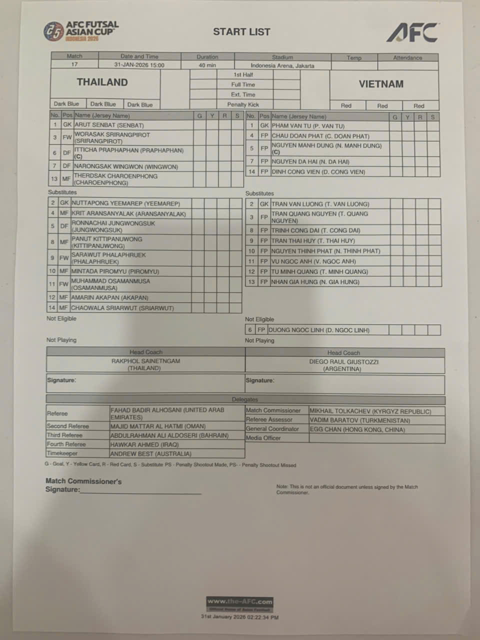 Đội hình dự kiến ĐT futsal Thái Lan vs ĐT futsal Việt Nam