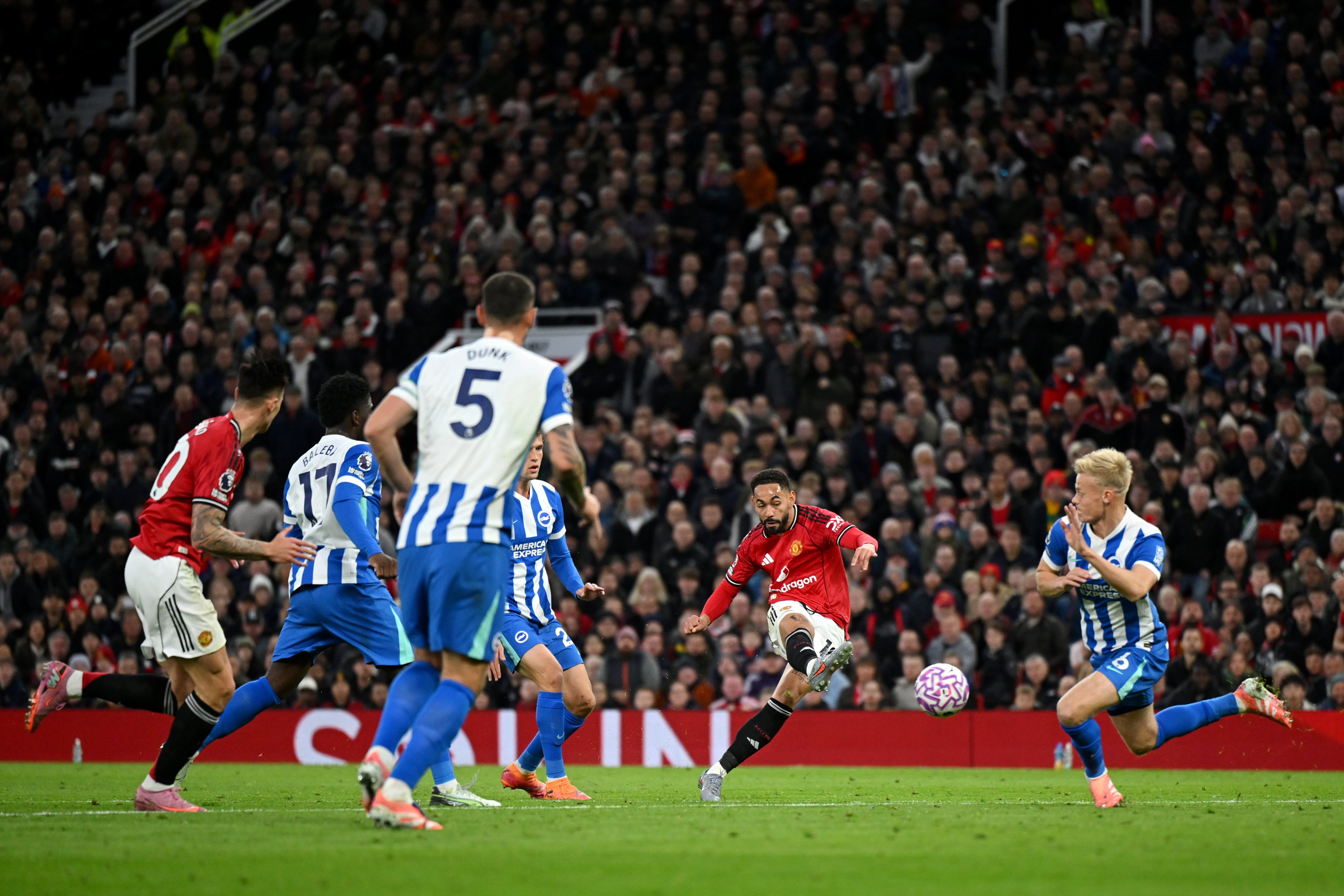 48'Không vào! MU vừa có pha phối hợp tốt bên cánh phải và Bruno Fernandes dứt điểm ở cự ly gần nhưng thủ môn của Brighton vẫn kịp dùng tay đẩy bóng cứu thua.