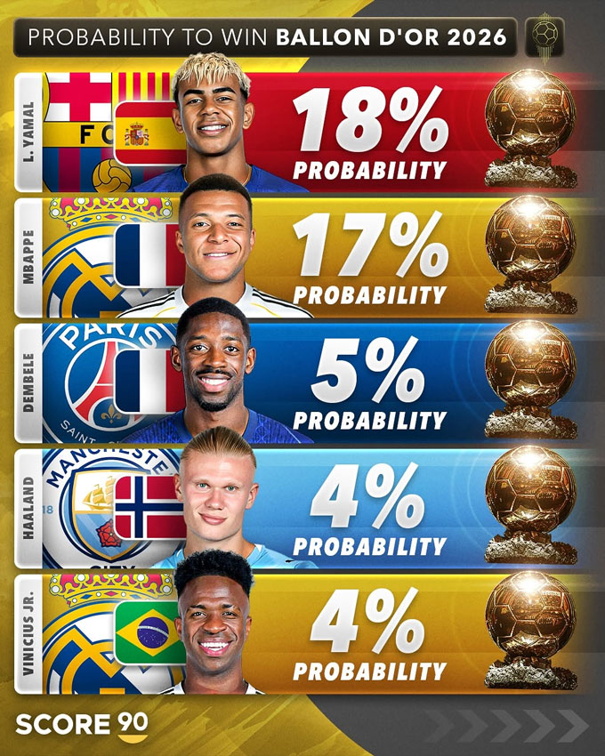 Đứng sát ngay phía sau là Kylian Mbappe với tỷ lệ 6/1 (tương đương 17%). Đương kim chủ nhân giải thưởng, Ousmane Dembele, bị xếp thấp hơn đáng kể với mức 14/1, tương đương chỉ khoảng 5% cơ hội bảo vệ danh hiệu.