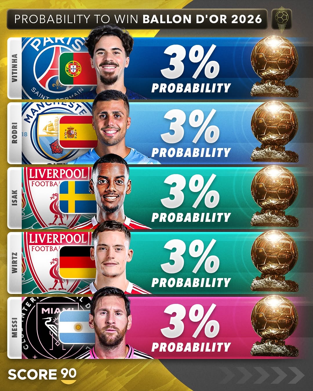 Những cái tên khác trong nhóm ứng viên tiếp theo bao gồm Erling Haaland, Vinicius Junior, Harry Kane, Mohamed Salah và Jude Bellingham, mỗi người được đánh giá có khoảng 4% khả năng giành chiến thắng.