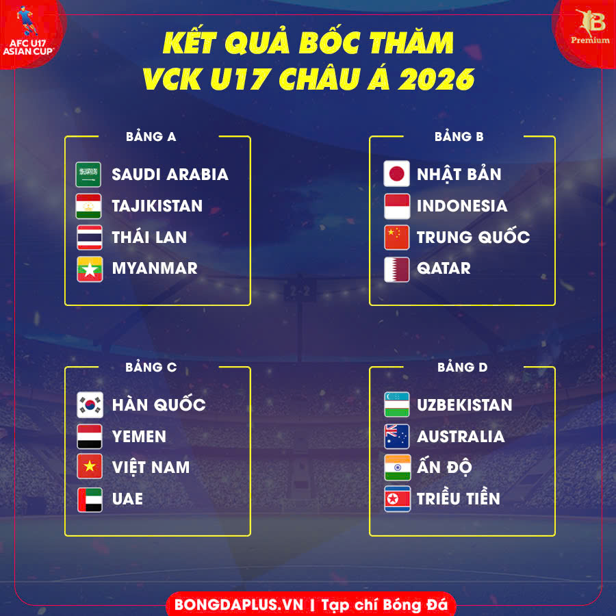 Chiều 12/2, Liên đoàn Bóng đá châu Á (AFC) đã tiến hành bốc thăm vòng bảng giải U17 châu Á 2026. Theo đó, U17 Việt Nam nằm ở bảng C với các đối thủ U17 Hàn Quốc, U17 Yemen và U17 UAE. Cần nhắc lại, VCK U17 châu Á 2026 cũng đồng thời là vòng loại World Cup U17 2026.