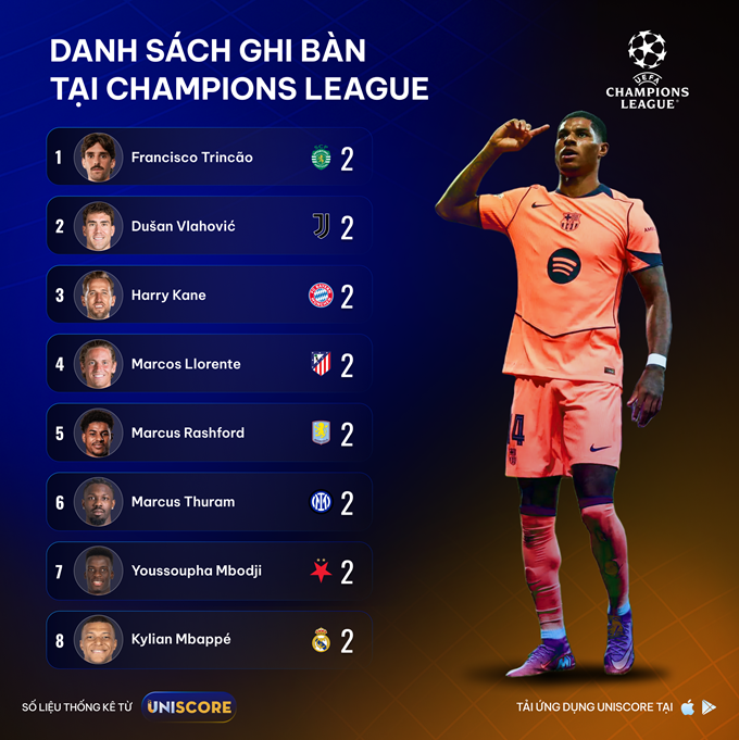 Không có cầu thủ nào lập hat-trick, nhưng đã có tới tám cái tên cùng chia sẻ ngôi đầu danh sách ghi bàn nhờ những cú đúp ấn tượng. Danh sách này trải dài từ các tiền đạo ngôi sao như Kylian Mbappé (Real Madrid), Harry Kane (Bayern Munich), Marcus Thuram (Inter Milan) và Dušan Vlahović (Juventus), đến những gương mặt ít được kỳ vọng hơn như Jonathan Burkardt (Eintracht Frankfurt) hay Francisco Trincão (Sporting CP). Đáng chú ý, sự trở lại của Marcus Rashford trong lần đầu khoác áo Barcelona ở Champions League cũng để lại nhiều hứng khởi. Bất ngờ hơn cả, hai hậu vệ Marcos Llorente (Atlético Madrid) và Youssoupha Mbodji (Slavia Praha) cũng góp mặt trong danh sách này.
