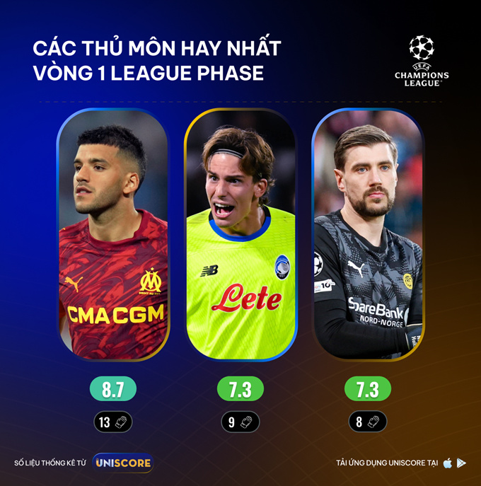 Có 6 trận giữ sạch lưới ở vòng 1, thuộc về 7 thủ môn của Man City, PSG, Arsenal, Inter Milan, Tottenham Hotspur, Olympiacos và Pafos. Tuy nhiên, người hùng thầm lặng phải kể đến Gerónimo Rulli (Marseille) với 13 pha cứu thua – cao nhất vòng đấu. Nếu không có anh, Real Madrid có lẽ đã thắng đậm hơn nhiều. Đứng sau Rulli là Marco Carnesecchi (Atalanta) với 9 lần cứu thua, và Nikita Khaykin (Bodø/Glimt) với 8 lần cản phá.