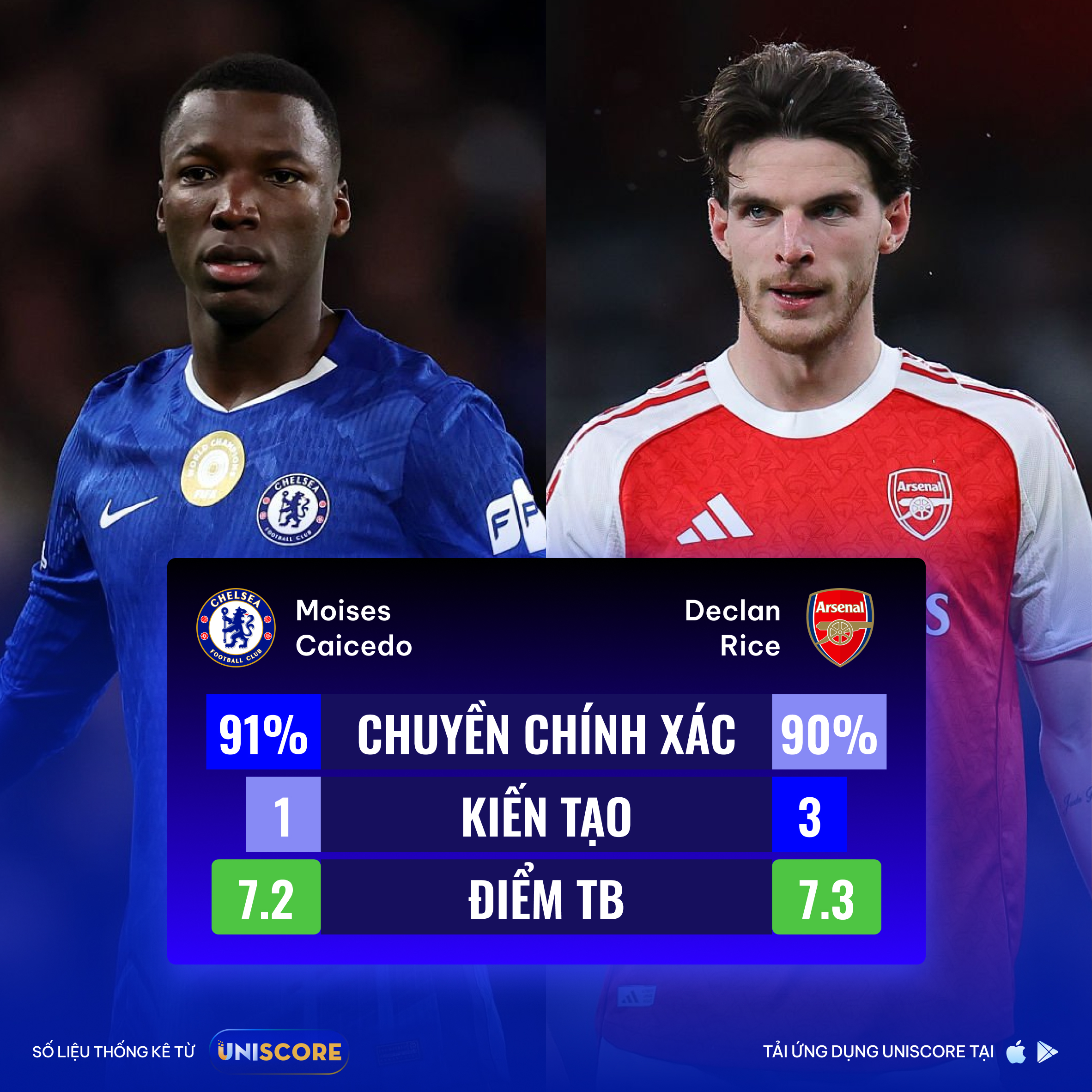 Tâm điểm sẽ là cuộc đấu ở tuyến giữa: Caicedo vs Declan Rice. Theo Uniscore, Caicedo chuyền bóng ấn tượng ngay cả khi bị áp sát (87%), giúp Chelsea thoát pressing. Rice lại toàn diện: đánh chặn tốt và dẫn đầu Arsenal về kiến tạo (3). Trên biên, Chelsea sở hữu Pedro Neto (3 bàn, 2 kiến tạo/5 trận gần nhất) và T năng 18 tuổi Estevão (9 bàn/13 trận cho CLB và ĐTQG). Arsenal có Saka – nguồn sáng tạo chủ lực, và Trossard – cầu thủ mà mỗi lần ghi bàn, Arsenal chưa từng thua. Một khoảnh khắc từ Saka, Enzo Fernández hay một pha xử lý cá nhân hoàn hảo có thể quyết định trận đấu.