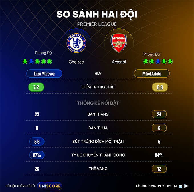 UNISCORE: Phân tích số liệu trước trận Chelsea vs Arsenal