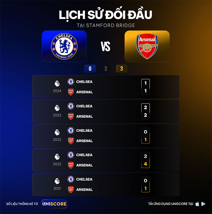 Chelsea có thành tích sân nhà ấn tượng, chỉ thua 2 trong 16 trận Premier League gần nhất. Ở các trận derby London tại Stamford Bridge, họ cũng thường chơi tốt với 8 chiến thắng và 3 trận hòa trong 12 trận gần đây. Tuy nhiên, Arsenal mới là đội chiếm ưu thế đối đầu. Chelsea đã không thắng Arsenal tại Stamford Bridge suốt 6 trận EPL liên tiếp (3 hòa, 3 thua) và chỉ có 1 chiến thắng trong 11 lần chạm trán gần nhất. Arteta cũng chưa từng thua tại đây kể từ khi dẫn dắt Arsenal. Arsenal đồng thời thể hiện phong độ sân khách xuất sắc, chỉ thua 1 trong 20 trận gần nhất, và hiếm khi sảy chân sau các trận đấu cúp châu Âu.