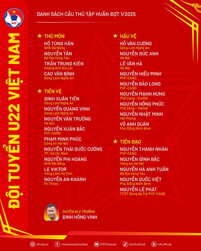 U22 Việt Nam hiện đã tập trung tại Hà Nội, trong đợt rèn luyện đầu tiên trong năm 2025. HLV Kim Sang Sik uỷ quyền cho trợ lý Đinh Hồng Vinh dẫn dắt đội. 26 cầu thủ được tập trung lần này đa phần là những gương mặt có kinh nghiệm tại hạng Nhất, V.League cũng như triển vọng từ nước ngoài.