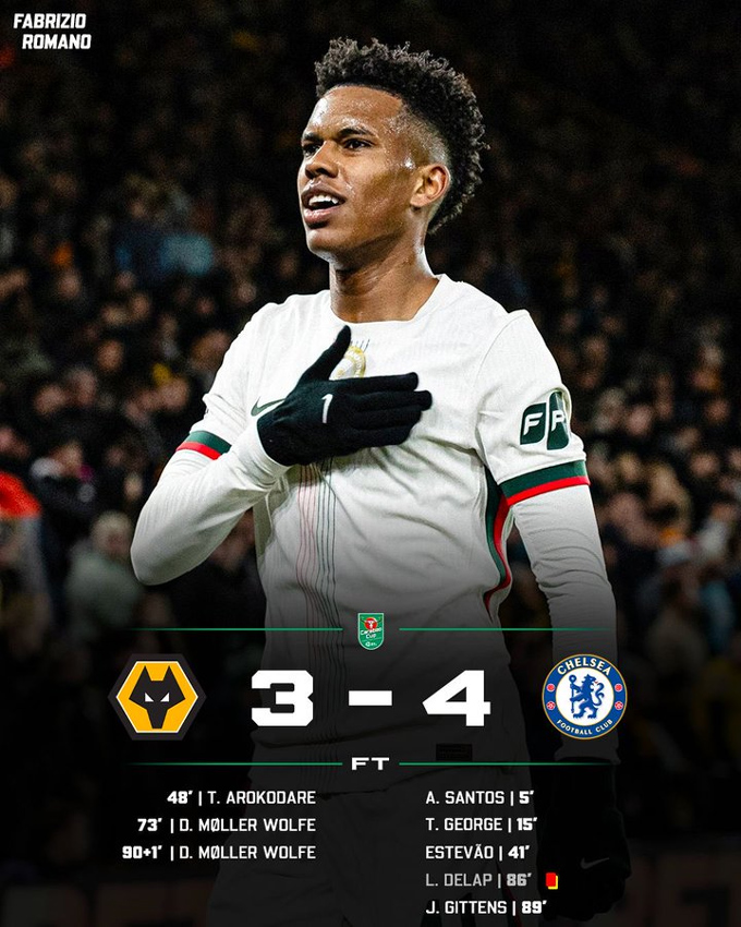 Dẫu vậy, Wolves vẫn không bỏ cuộc và họ rút ngắn cách biệt xuống 3-4 ở phút bù giờ thứ nhất khi Wolfe hoàn tất cú đúp. Trong thời gian ít ỏi còn lại của trận đấu, Wolves nỗ lực ghi thêm bàn nhưng không thành. Họ đành chấp nhận thua Chelsea với tỷ số chung cuộc 3-4.