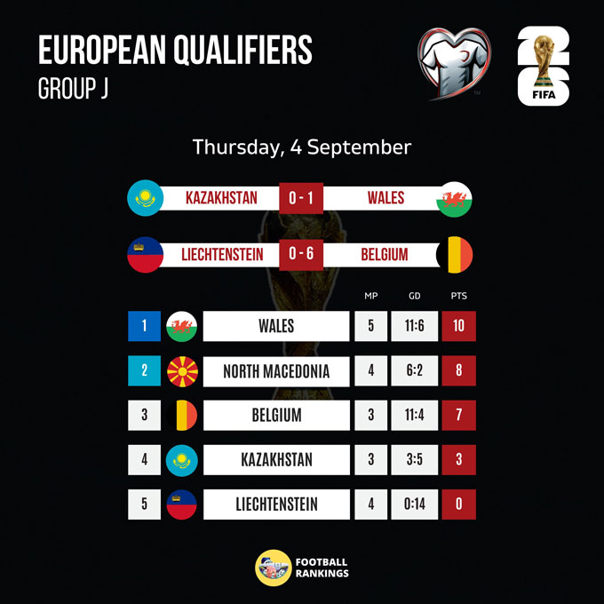 Dù có 3 điểm, Bỉ vẫn chỉ đứng thứ 3 tại bảng J với 7 điểm sau 3 trận. Họ xếp dưới Bắc Macedonia (8 điểm sau 4 trận) và Xứ Wales (10 điểm sau 5 trận).