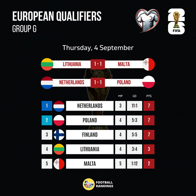 Hòa 1-1, Hà Lan có được 7 điểm sau 3 trận và tạm dẫn đầu trong khi Ba Lan đứng thứ 2, bằng điểm nhưng kém hơn về hiệu số.